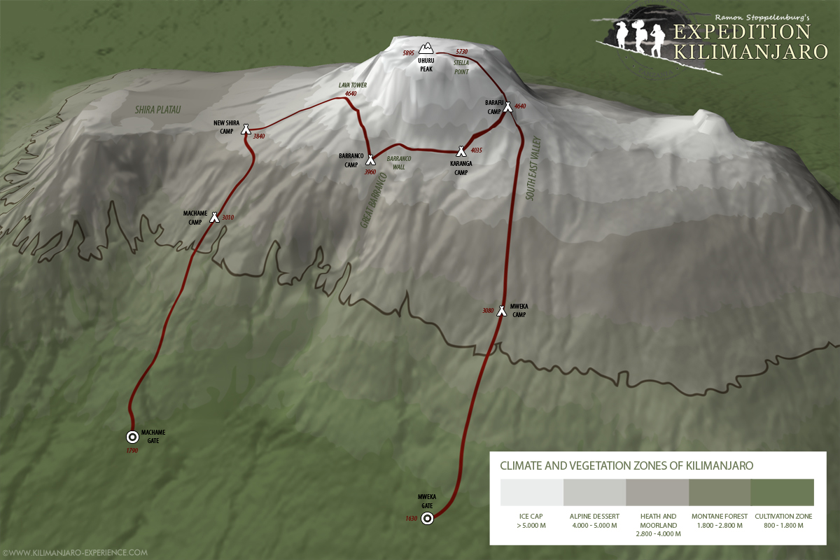 From tropical rainforest to glaciers and eternal snow. On this page you'll see step by step how the Machame Route takes you to the roof of Africa.
